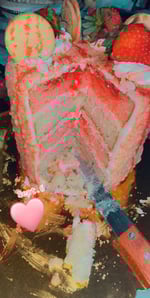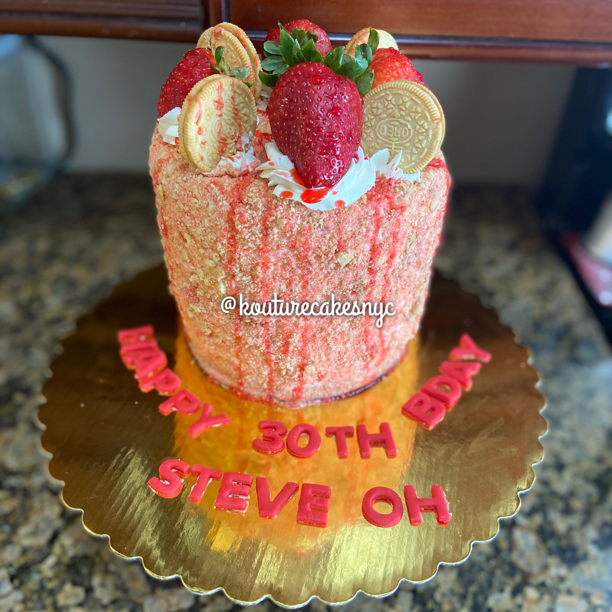 Frosting: Strawberries and Creme filling. Frosted with vanilla butttercream, covered in Strawberry crunch crumbs, strawberry syrup drizzle, topped with Golden Oreo cookies and fresh strawberries.